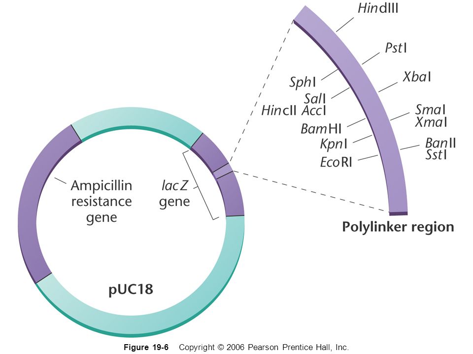 The Artificial plasmid pUC18 has been genetically manipulated to incorporate – a gene for antibiotic protection from Ampicillin (ampR), the lacZ genes containing a polylinker region and a promoter for the enzyme beta-galactosidase (lacZ) , with a progression of restriction sites. Treating with the endonucleases will make a nick that linearizes the roundabout plasmid DNA, and permit it to recombine with foreign DNA that has been cut with a similar endonuclease.